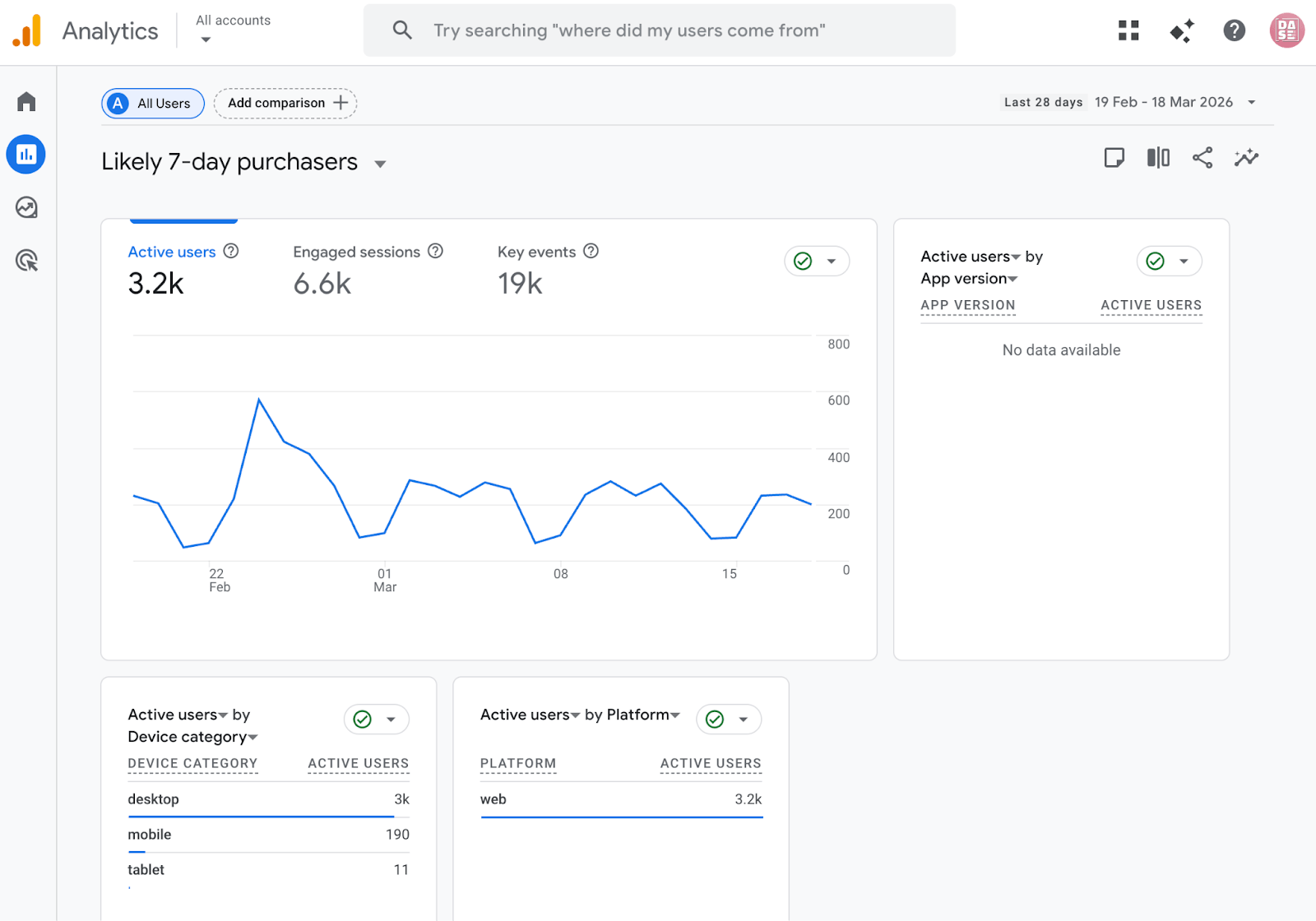 Ak už používate Google Analytics 4, GA4 je prirodzené miesto, kde začať. Je to najdostupnejšia cesta, pretože prediktívne metriky sú vstavané priamo v nástroji. Google ich generuje automaticky na základe dát vo vašom vlastníctve (property).