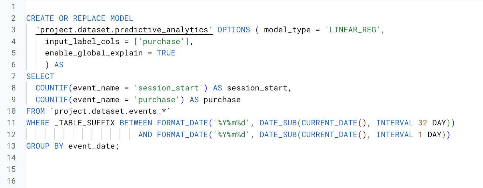 Jednoduchým príkladom je predikcia revenue na základe počtu sessions pomocou lineárnej regresie. V BigQuery máte historické dáta o návštevnosti a tržbách z GA4 BigQuery exportu.